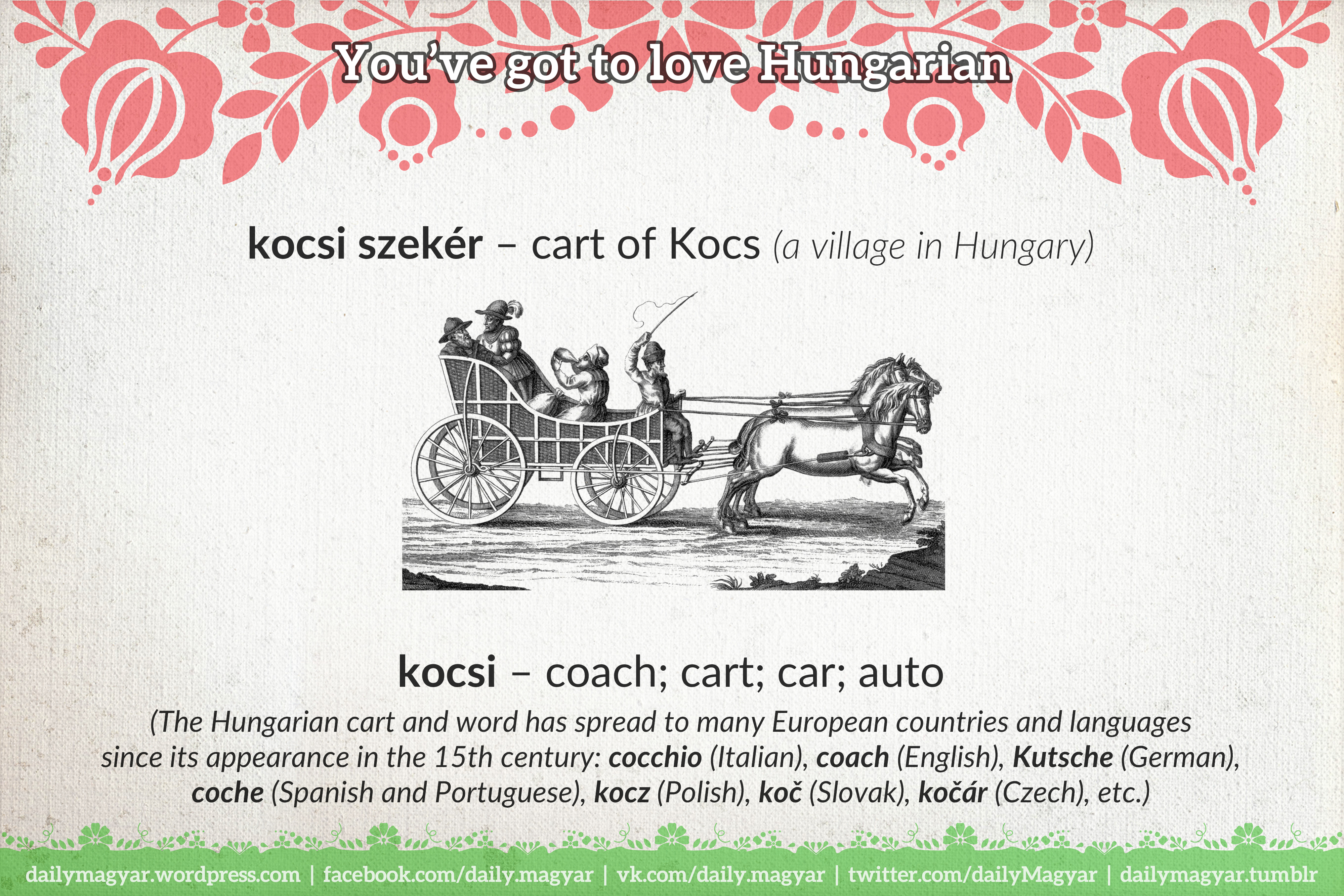 Es pues cuando dicha palabra originada en Húngria, Kocsi, comienza a transformarse, desde el alemán Kutsche, al italiano cocchio o el castellano coche.